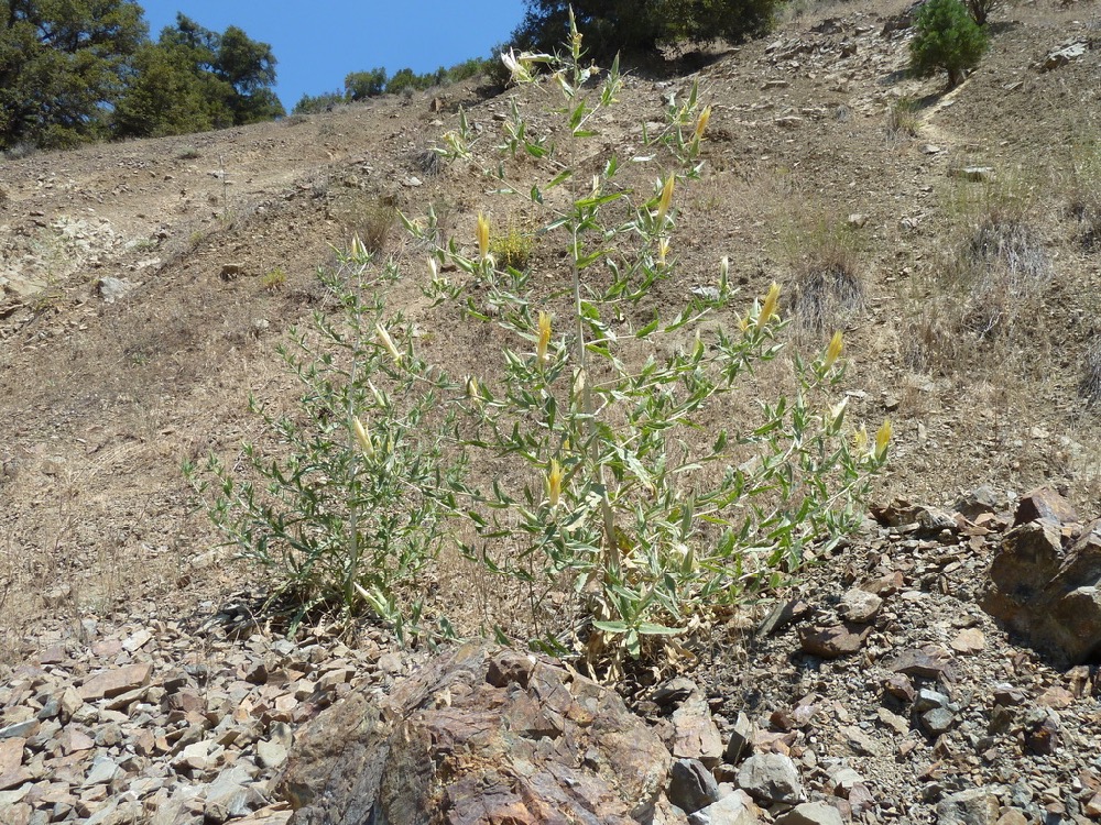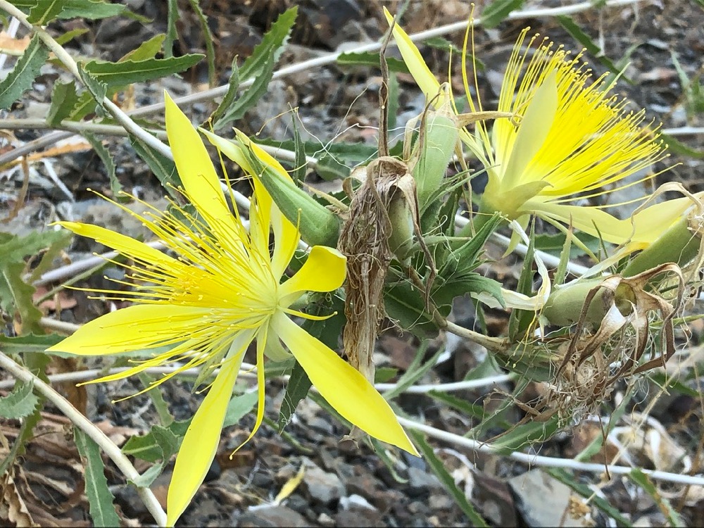 The common name giant blazingstar just about says it all. This is a very tall wildflower with an extremely showy and elegant flower! Giant blazingstar lights up the often harsh, sandy, rocky, dry and often disturbed environments that it thrives in. The brilliant yellow, star-shaped flower has five long, narrow, and pointed petals, with think yellow sepals in between. The flower center has many long, spectacular yellow stamens that make the flower look like an exploding firecracker. Blooms July-August. The whitish plant stem rises from a basal rosette of leaves that to some have a weedy appearance, however, the showy flowers make up for it. Giant blazingstar is well-suited for rock gardens and other dry, sun-baked, locations with poor soil and good drainage. It is a biennial or short-lived perennial with a deep taproot. Typically grows 2′-4′ tall. Grows in most western states. Giant blazingstar flowers are a source of nectar and pollen for native bees, butterflies and moths. Deer resistant.